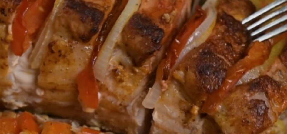 Stuffed Pork Loin with Tomato & Onion (Baked on Vegetable Rice)