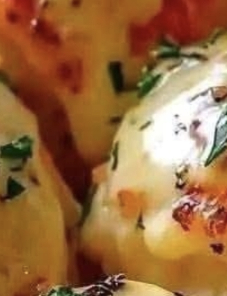The tender lobster meat pairs perfectly with a rich, garlicky, buttery sauce, creating a luxurious and aromatic experience with every bite.
