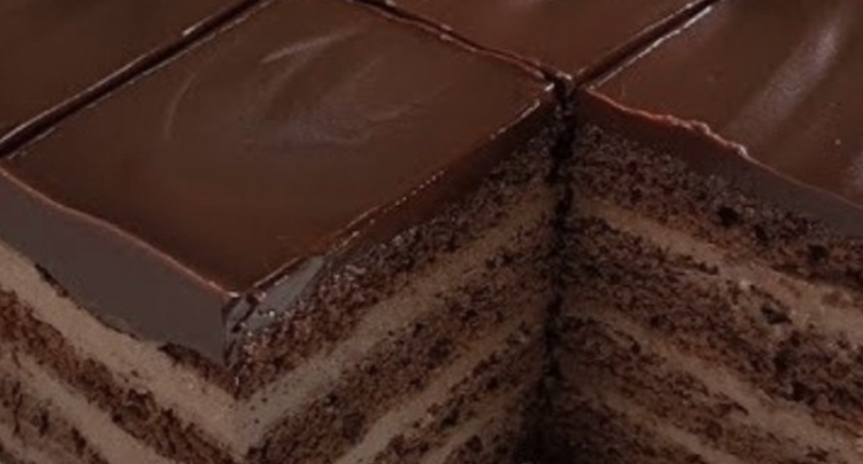 A soft chocolate sponge layered with silky chocolate cream and finished with a glossy chocolate ganache.