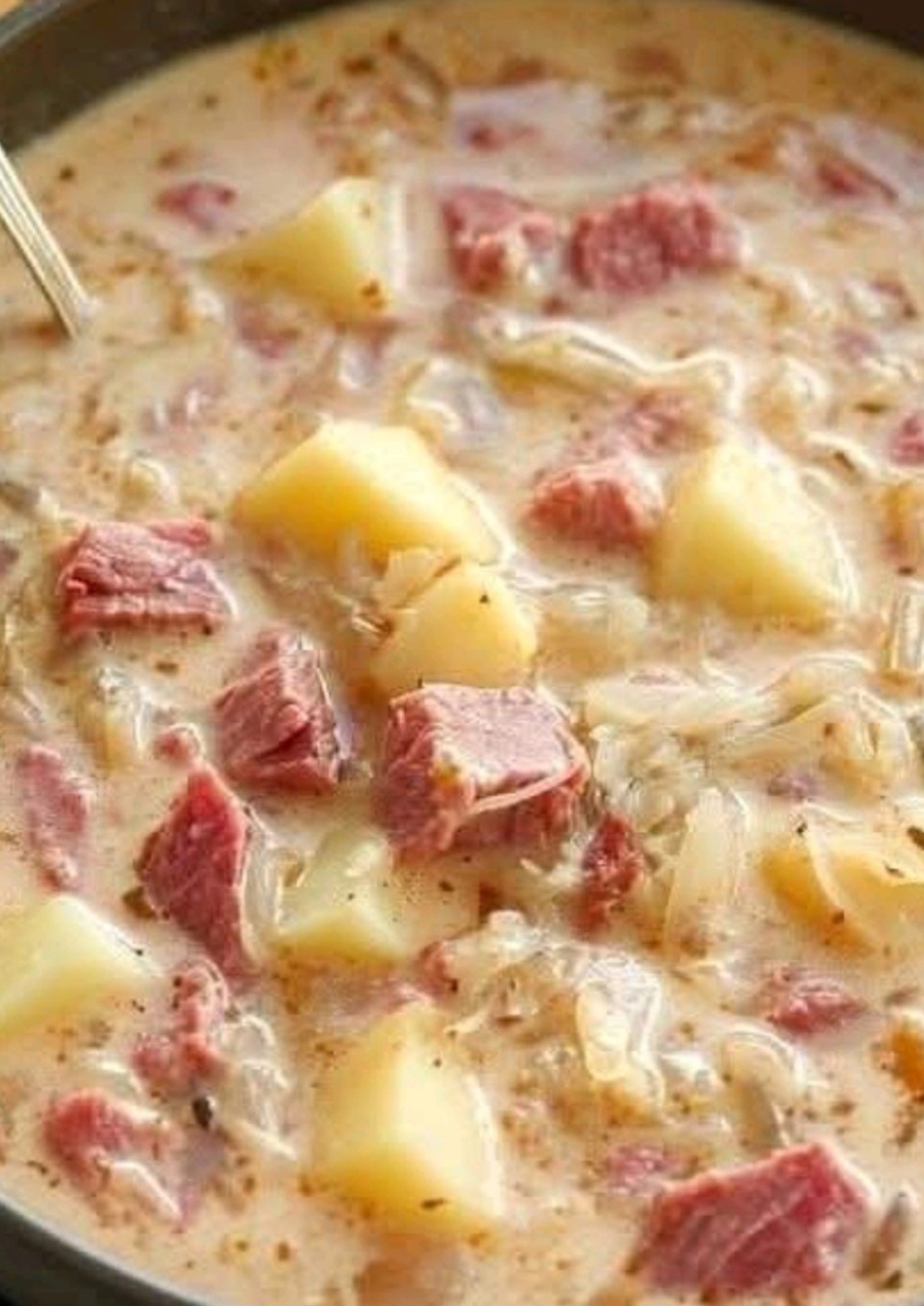 Creamy Reuben Soup is a savory soup that translates the core flavors of a Reuben sandwich into a liquid form. The recipe typically features a base of beef broth and cream, incorporating corned beef, sauerkraut, Swiss cheese, and Russian or Thousand Island dressing flavors. It is a cooked soup that is simmered and thickened before serving.