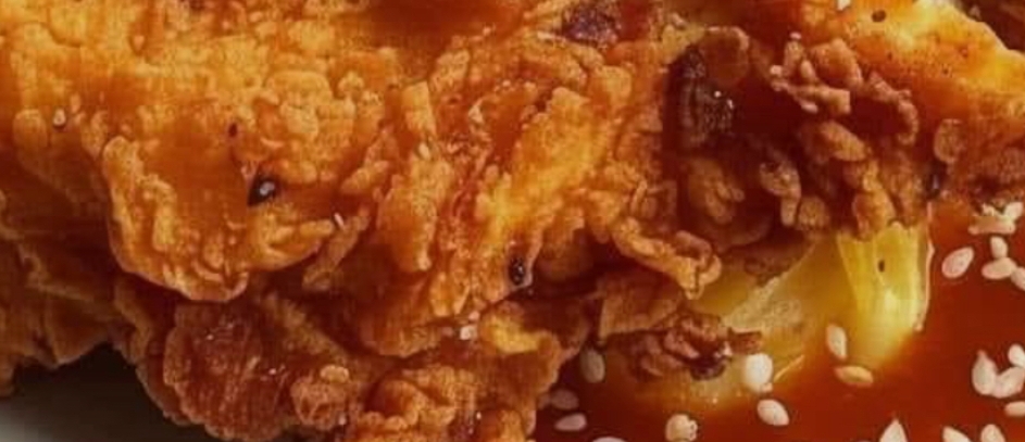 This dish looks like extra-crispy fried chicken breast served over creamy noodles with a sweet-savory glaze (Asian-inspired). Here’s a restaurant-style recipe to match the photo 👇