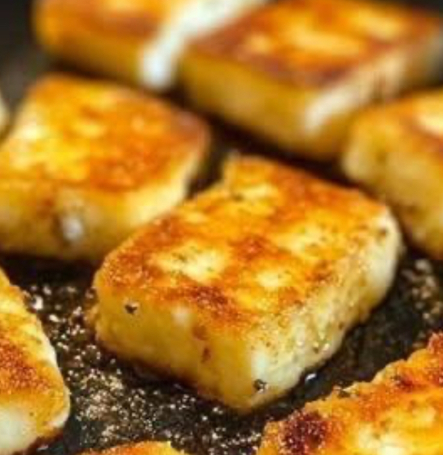 Wygląda pysznie! To wygląda na smażony ser halloumi lub inny ser typu „grill cheese” — chrupiący na zewnątrz, miękki w środku.