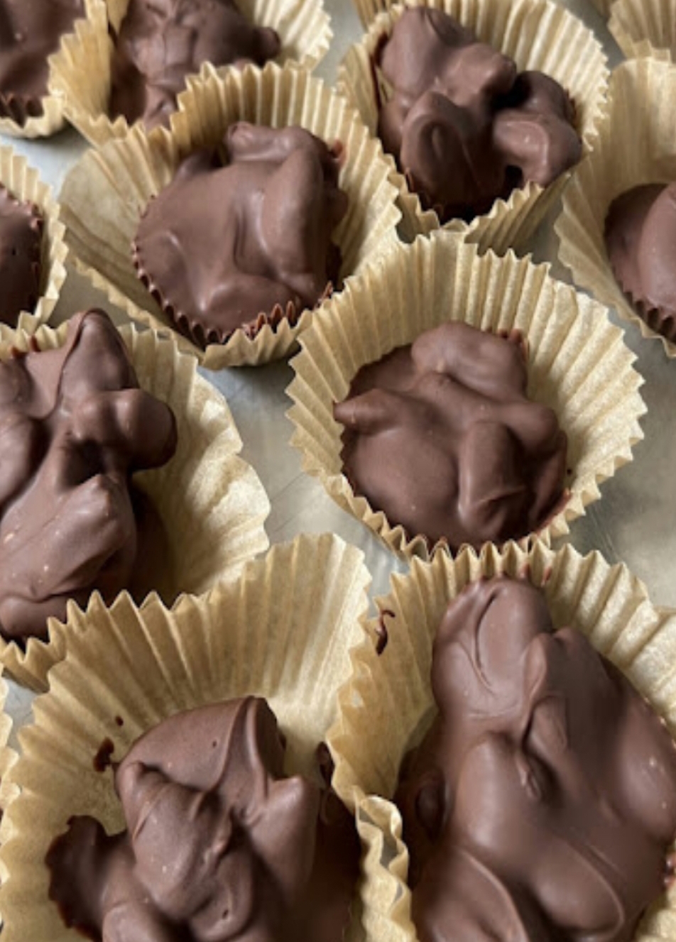 - Spoon a small amount of melted chocolate over each caramel-covered pecan cluster, spreading it slightly to cover the top.