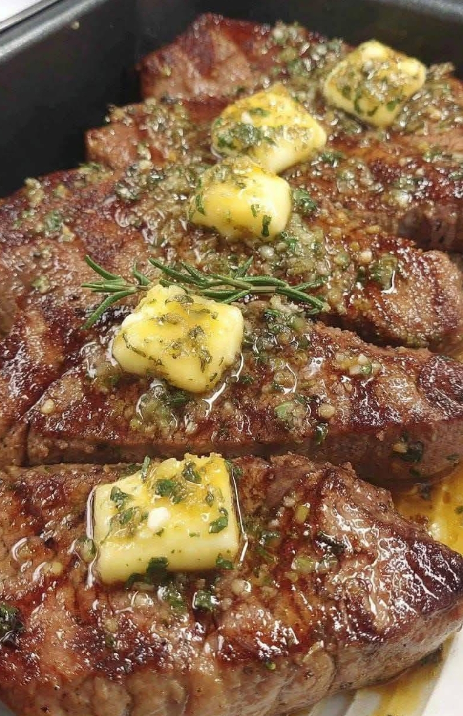 While steaks cook, mix softened butter with garlic, parsley, salt, and optional lemon juice.