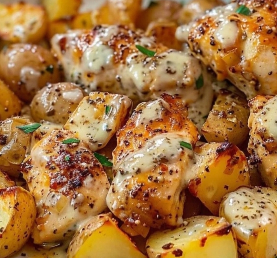 Ingredients:2 chicken breasts4–5 small or medium-sized potatoes3 tablespoons olive oilSalt and black pepper, to taste1 teaspoon garlic powder1 teaspoon paprika½ teaspoon Italian seasoning (optional)3 cloves garlic, minced¼ cup grated Parmesan cheeseFresh parsley, chopped (for garnish)Instructions:Preheat the oven to 400°F (200°C).Prepare the potatoes: Wash and cut them into bite-sized cubes. In a large bowl, toss the potatoes with 1½ tablespoons olive oil, salt, pepper, garlic powder, and paprika. Spread them on one side of a baking sheet.Prepare the chicken: Season the chicken breasts with salt, pepper, and Italian seasoning. Drizzle with the remaining olive oil.Add to the pan: Place the chicken on the other side of the baking sheet.Bake for 25–30 minutes, or until the chicken is fully cooked and the potatoes are golden and tender.Add garlic and Parmesan: In the last 5 minutes, sprinkle minced garlic and Parmesan cheese over the chicken and potatoes, then return to the oven until cheese melts and edges are crisp.Garnish with chopped parsley and serve warm.Serving suggestion:Serve with a side of steamed vegetables or a simple green salad for a complete meal.