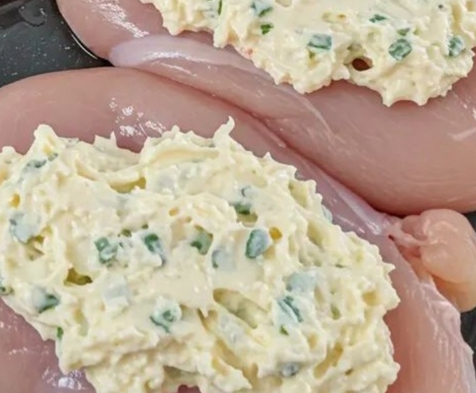 Coat the chicken: Pat the chicken breasts dry with paper towels. Evenly spread the creamy mixture over each chicken breast, ensuring full coverage and a nice thick layer on top. Place the coated breasts in the prepared baking dish. 🍗🧈