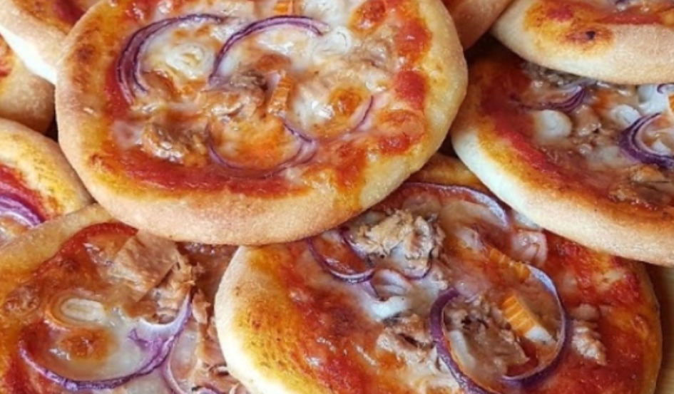 Here is a perfect mini-pizza recipe just like the ones in your pictures — soft, fluffy dough with tuna, cheese, and onion toppings. 🍕✨