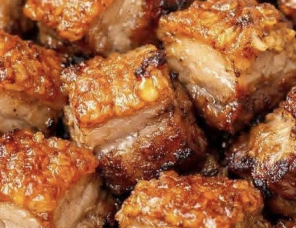 Pat the pork belly cubes very dry with paper towels. This is what helps the skin turn into crisp crackling instead of staying chewy.