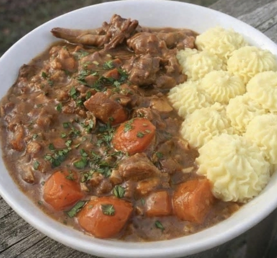 Enjoy your hearty and flavorful rabbit stew with mashed potatoes!
