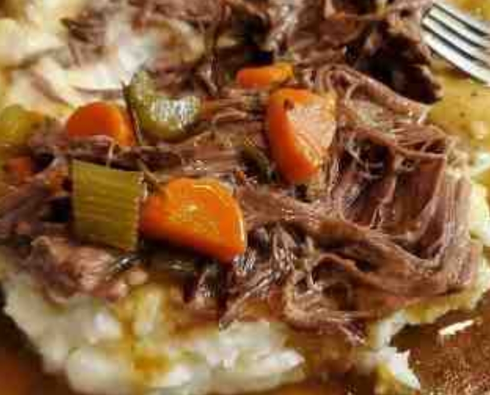 IntroductionNothing says comfort food like a tender slow cooker pot roast served with rich homemade gravy and creamy mashed potatoes. This classic recipe is perfect for busy days—just set it in the slow cooker and let it work its magic. By the end of the day, you’ll have melt-in-your-mouth beef, flavorful vegetables, and silky gravy ready to serve with fluffy mashed potatoes. It’s the ultimate hearty dinner for family gatherings or cozy nights at home.IngredientsFor the Pot Roast:3–4 pounds beef chuck roast1 onion, sliced4 carrots, cut into chunks1 pound baby potatoes (optional, if not serving with mashed potatoes)4 cloves garlic, minced2 cups beef broth1/2 cup red wine (optional, for depth of flavor)2 tablespoons tomato paste2 tablespoons Worcestershire sauce2 sprigs fresh rosemary2 sprigs thyme2 bay leaves2 tablespoons olive oilSalt and black pepper, to tasteFor the Gravy:2 tablespoons cornstarch2 tablespoons cold waterFor the Mashed Potatoes:2 pounds potatoes, peeled and cubed4 tablespoons butter1/2 cup milk (or heavy cream, for richer flavor)Salt and pepper, to tasteInstructionsPrepare the RoastPat the beef dry and season generously with salt and black pepper.Heat olive oil in a skillet over medium-high heat. Sear the roast on all sides until browned.Assemble in the Slow CookerPlace onion, carrots, and garlic at the bottom of the slow cooker.Add the seared roast on top of the vegetables.Pour in beef broth, wine (if using), tomato paste, and Worcestershire sauce.Add rosemary, thyme, and bay leaves.Slow CookCover and cook on low for 8–9 hours or high for 4–5 hours, until the beef is fork-tender.Make the Mashed PotatoesWhile the roast cooks, boil the cubed potatoes in salted water until tender.Drain and mash with butter, milk, salt, and pepper until smooth and creamy.Prepare the GravyRemove the roast and vegetables from the slow cooker.Strain the cooking liquid into a saucepan.Whisk together cornstarch and cold water, then stir into the liquid.Simmer until thickened into gravy.ServeSlice or shred the beef and serve it with the vegetables.Spoon gravy over the roast and pair with creamy mashed potatoes.Serving SuggestionsGarnish with fresh parsley for a touch of color.Serve with a green salad or roasted Brussels sprouts for balance.Leftovers make delicious sandwiches or can be turned into a hearty beef stew.Tips & VariationsNo wine? Replace it with extra beef broth.Extra creamy mash: Add roasted garlic or sour cream to the potatoes.Make ahead: The roast tastes even better the next day as the flavors deepen.✨ This Slow Cooker Pot Roast with Gravy & Mashed Potatoes is a complete meal that’s rich, comforting, and perfect for feeding the whole family. With minimal prep and the magic of slow cooking, you’ll enjoy a restaurant-quality dinner right at home.