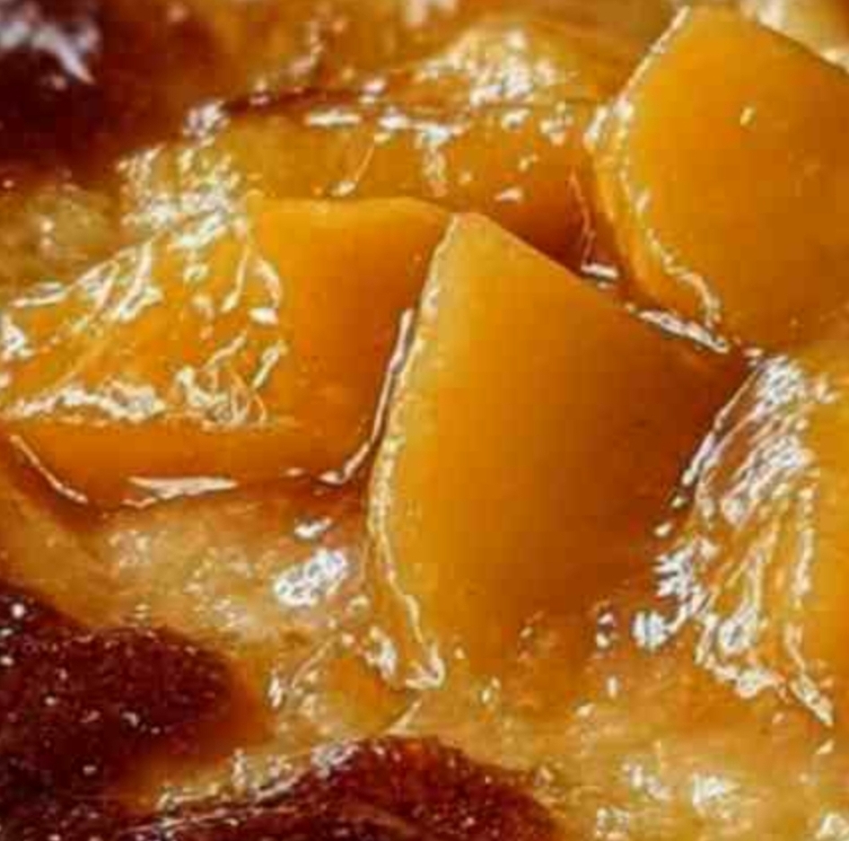 - Carefully pour this sauce over the peach mixture in the baking dish. (Don’t stir—it will sink down and form a rich caramel sauce as it bakes.)