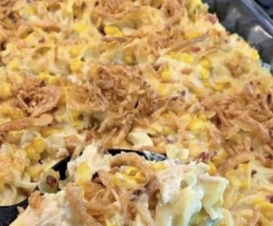 In a medium bowl, mix the cooked egg noodles, shredded chicken, corn, milk, cream of chicken soup, onion, garlic, cheese (add extra if you like it extra cheesy!) bacon, and add salt and pepper to taste.