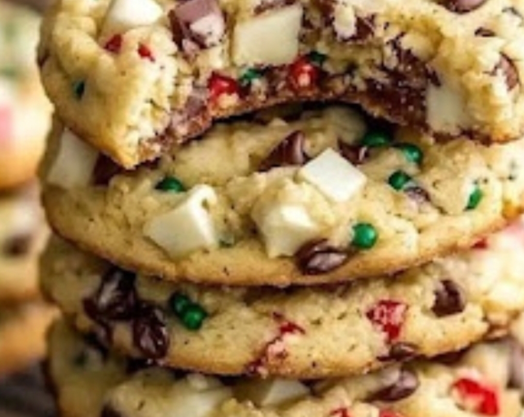 6. Fold in the chocolate chips, crushed candy canes, and white chocolate chips.